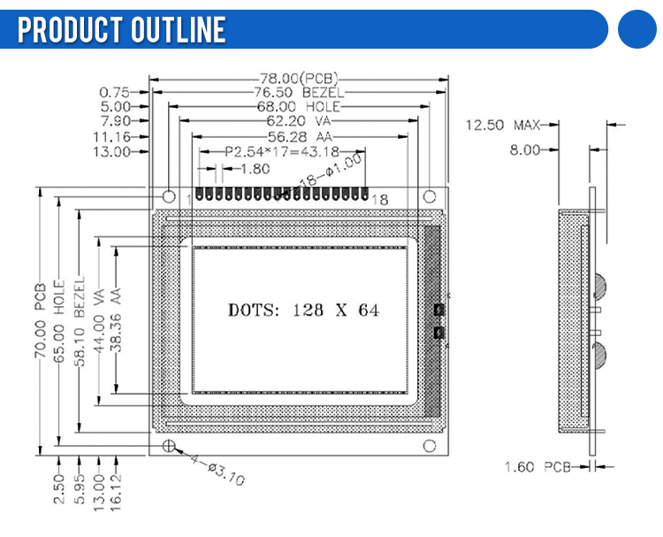 Blue Film 12864C-5 128X64 Dot Matrix LCD Display Module SBN0064 Controller 18PIN Parallel Port